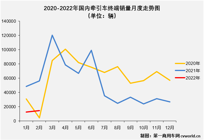 根據(jù)第一商用車網最新掌握的終端銷量數(shù)據(jù),2022年2月份,國內牽引車銷售1.46萬輛(交強險口徑,不含出口和軍品,下同),環(huán)比增長16%,同比下降74%,比去年同期少銷售約4.1萬輛,在2022年遭遇“2連降”。而實際上,2月份牽引車市場出現(xiàn)下滑并不意外,一方面上年基數(shù)較高(5.61萬輛),另一方面,也是最主要的原因——需求,由于公路運價持續(xù)低位,物流運輸市場繼續(xù)低迷,再加上疫情的影響,在此情況下,牽引車市場的需求很難被激發(fā)出來。